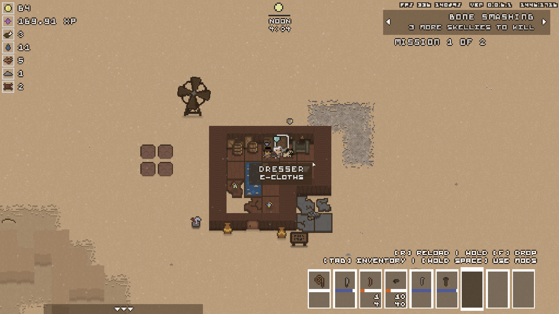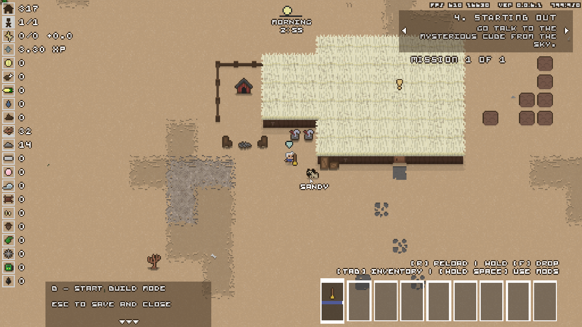 The photo on the left is the main menu of the game. Under "Options" the only settings are to reset the quests, reset the map, or reset the entire game. Under "Prefab Designer" it takes you into a different version of the game which may be for the creators to test things in (I'm not completely sure). So other than the reset options and the volume sliders on the bottom, there are no settings for this game. The picture on the right is of the starter house, I took this right after completing the first quest. In the picture you can see the player (the white haired character) and the dog companion you get. Using the little doghouse on the side, you are able to cycle through two options for the apperance of your dog, and you can give it a custom name. I named mine Sandy because the game is set in a desert (creative, I know). There is not much of a tutorial, the litle bit you get is from talking to the main quest giver, and NPC robot/alien named E.D.I.E. It isn't too hard to figure out how to do things without a thorough tutorial, and I liked how the creator tried to put most of the tutorial into the quests.