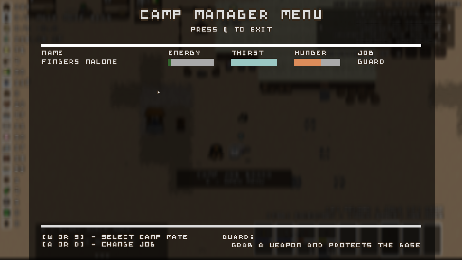 There are a lot of NPCs in Sand. A lot of them give you quests, some are purely cosmetic, and some can help you out. The image on the left shows the player talking to an NPC named Duke. Duke is your first (maybe only) hireable NPC. Pictured you can also see the dog, and two other NPCs hanging around the building. These two characters are both stationary quest-giving characters. Also in the picture you can see that Duke talks about "He Who Codes." This becomes a trend through the game to the point where I'd actually consider the coder a character. He is mentioned by several characters and in one area there is even a shrine with offerings built for him.