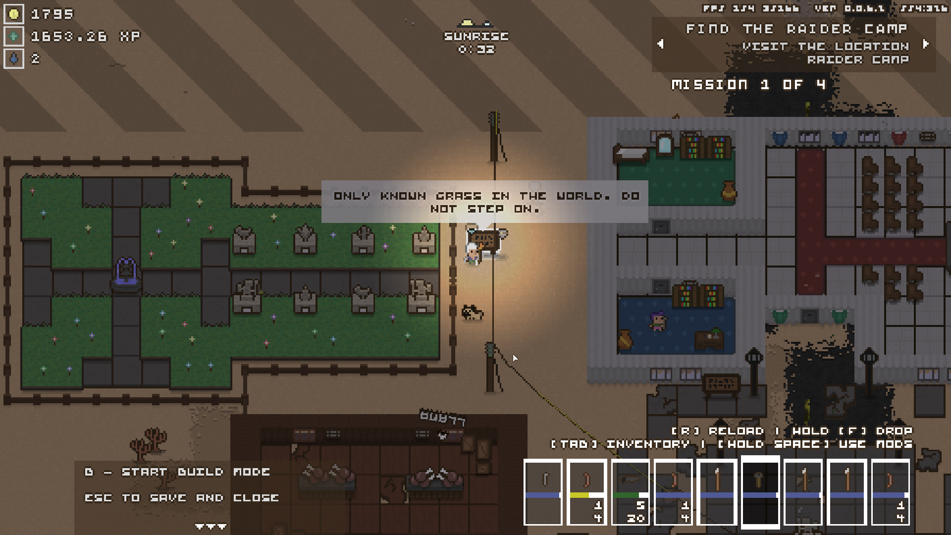 So the world in sand is pretty simple, the whole thing is just sand other than occasionally you'll run into buildings/ruins or some areas of stone. The world is split into a grid, its not fully open where you can travel wherever, you have to travel across/through the different boxes in the grid. I didn't get to check out every area, but I did discover a single place that has grass. Anchor Rage is a city that was one of the last sets of quests I was able to start, and it is far more advanced from any other part of the game. They have electricity and stores and villagers existing freely. The area of grass is fenced off so you cannot access it. I believe it just functions as a little joke put there by the coder.